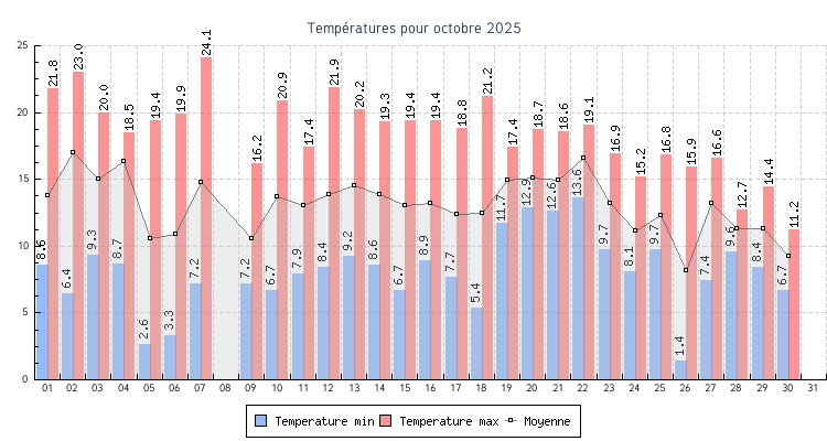 | 10 | 6.7 C 01:09 | 20.9 C 16:17 | 13.7 C | N/A km/h (N/A km/h) | 90 |